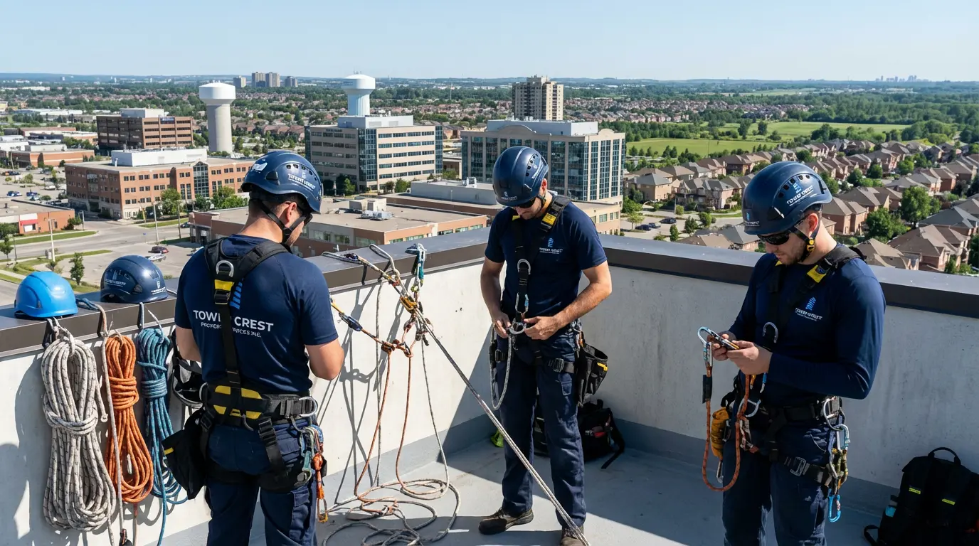 Mount Pleasant’s newer towers typically have rooftop anchor systems compatible with rope descent access. TowerCrest reviews each building’s structural anchor certification before deploying crews, ensuring safe and compliant access on every Brampton job site.