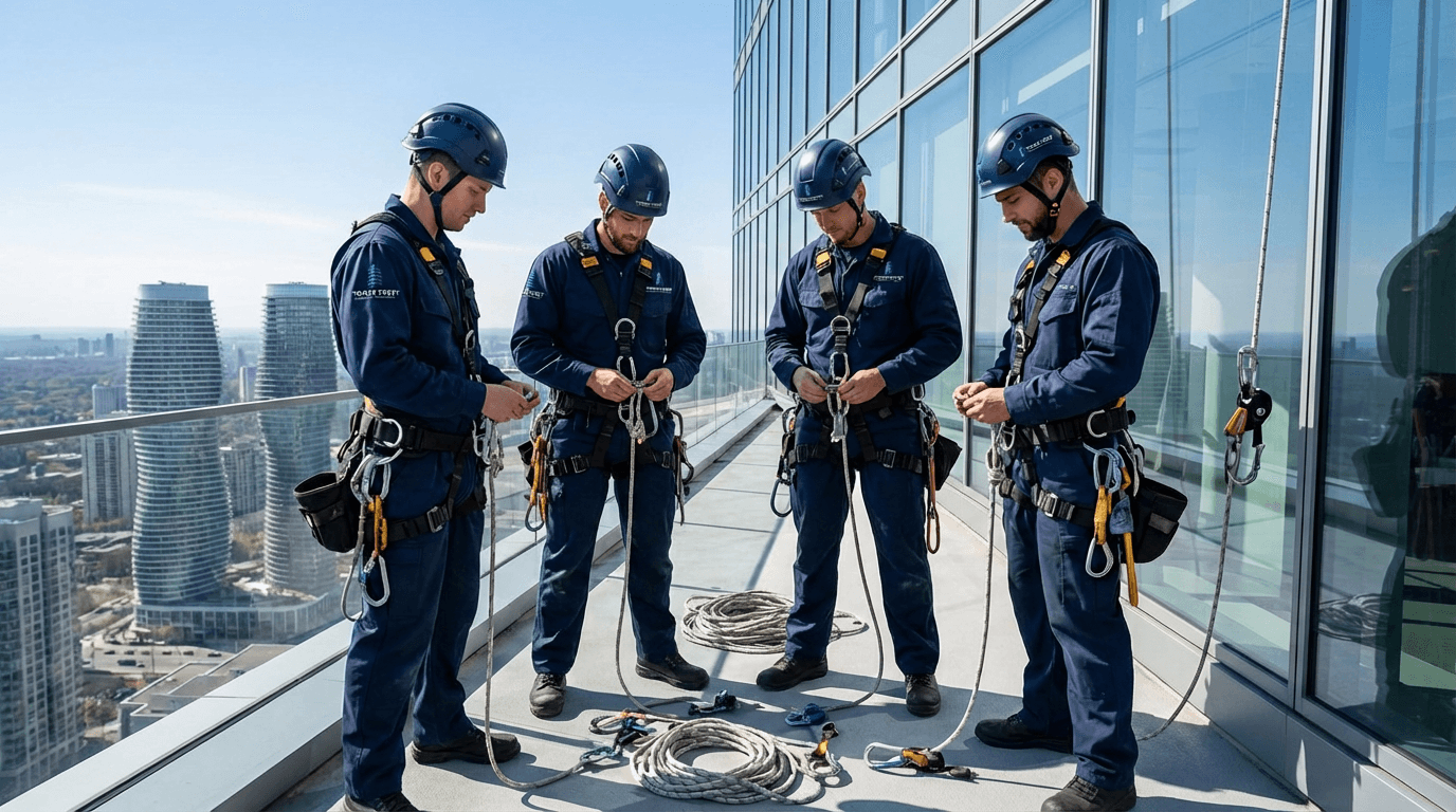 Port Credit towers typically require swing stage or rope descent access depending on rooftop anchor availability. TowerCrest conducts an on-site assessment before every project to determine the safest, most efficient method for each building’s specific architecture.